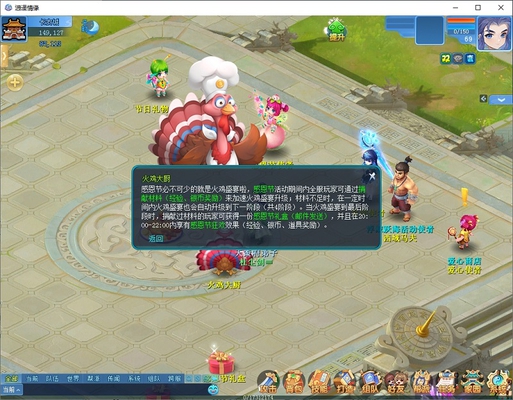 感恩节到了,大家一起参与火鸡盛宴吧!少侠可通过完成日常活动、捕捉火鸡活动获得火鸡盛宴的材料。玩家可以捐献火鸡盛宴的材料来加速火鸡盛宴成型的时间,当材料不足时火鸡盛宴也会在相应时间内自动升级到下一阶段。